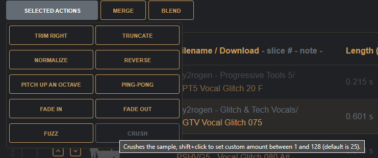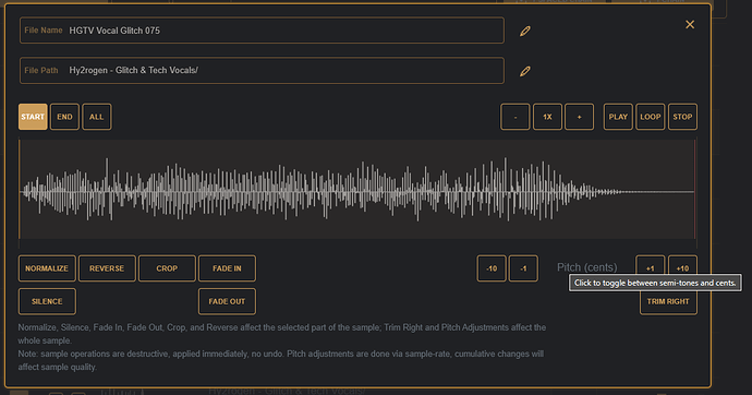 - Pitch up/down in cents in sample editor panel. (click the ‘Pitch (semi-tones)’ link to toggle between semi-tones and cents.)