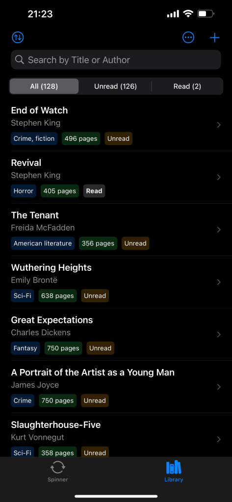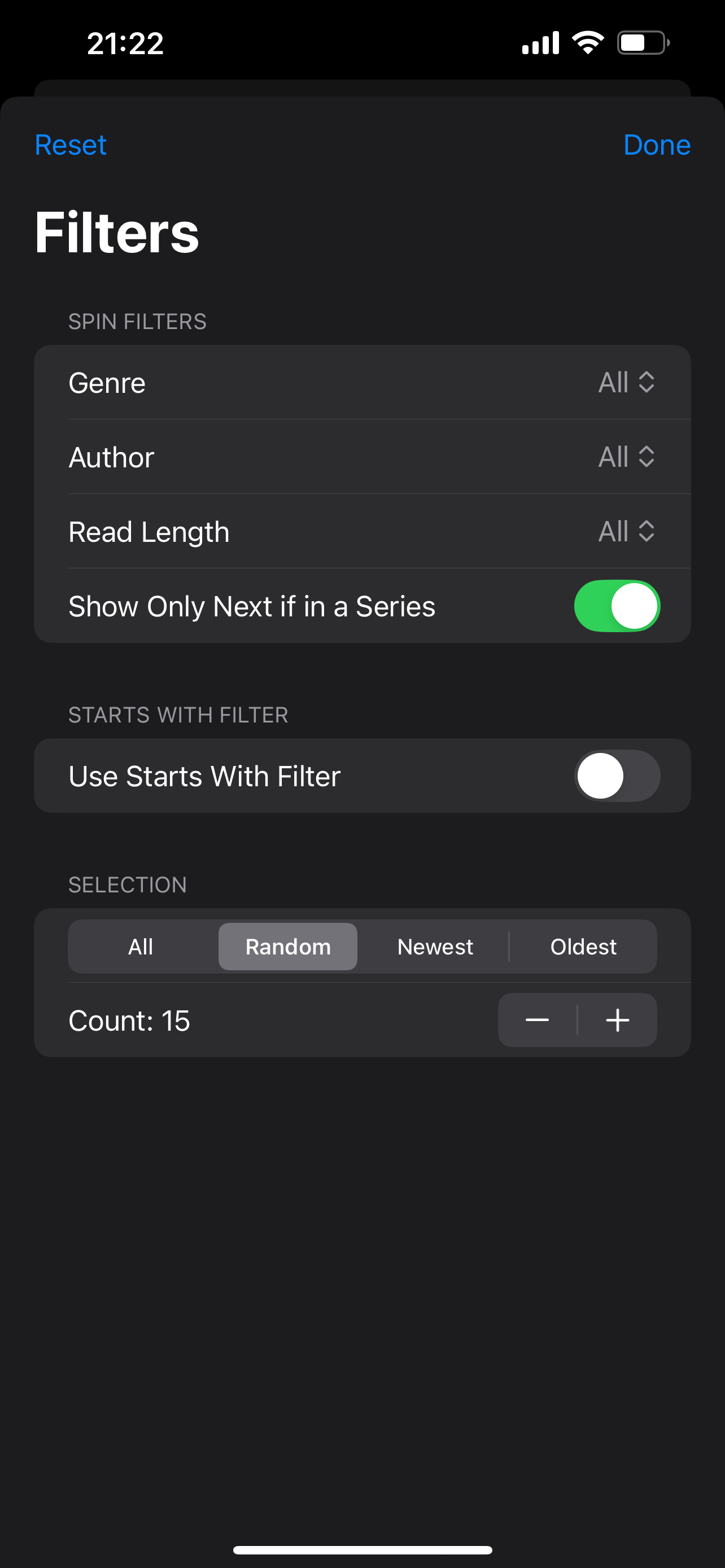 What started out fairly simple, quickly crept in scope, adding filters for challenges, like authors first or last name starting with a specific letter, or genre and read length to only showing the next unread book in a series to prevent the spinner giving out of order book choices.