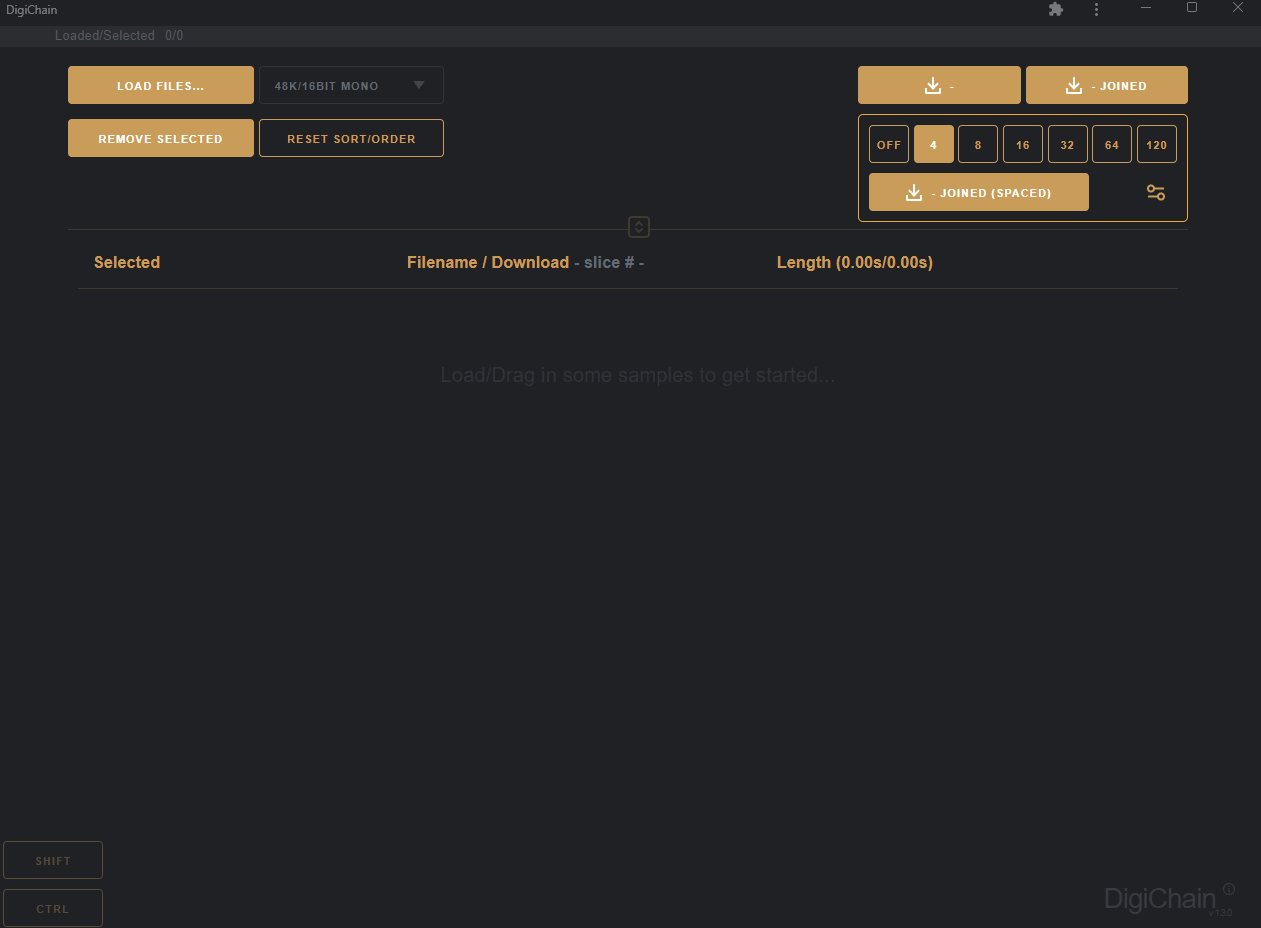 - Holding the Shift key while clicking the joined buttons will add the chain files to the top of the samples list instead of outputting inside a zip file.