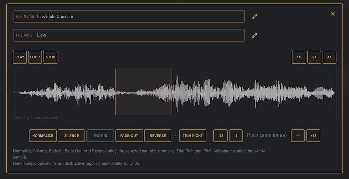 - Use the per sample edit panel; to make basic edits to the samples in the list, normalize, trim silence from the end, reverse, half the playback speed, or double the playback speed – all sample edit operations are destructive! If you want to keep the original audio intact, create a duplicate with the sample duplicate icon.