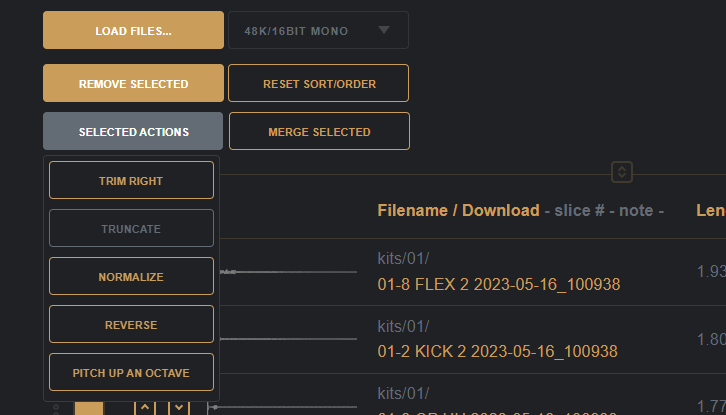 - Import .wav/.syx audio files and converts them to the chosen audio context (e.g. 48k/16bit, 44.1k/24bit etc) – if the chosen context is mono, stereo samples can be processed as the Left, Right, or a Sum of both channels to mono when exporting, the playback preview of the sample will reflect this choice. In a stereo context, mono files stay as mono (unless the sample has been resampled in this context). The audio context can be changed, but sample rate changes require the list to be discarded.