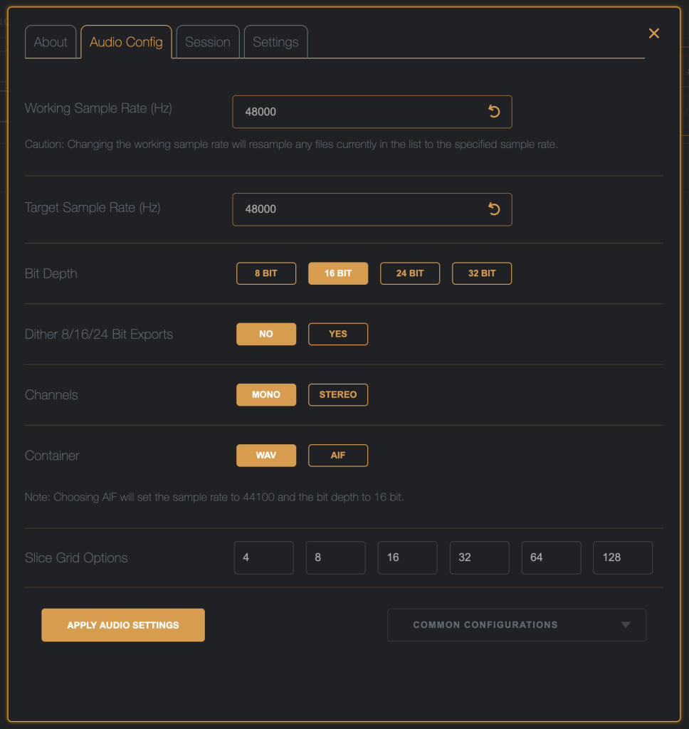 By default, the app will be ready to export for the Digitakt (48kHz 16bit Mono) – to change this – click the text that reads that information to open the audio configuration panel.