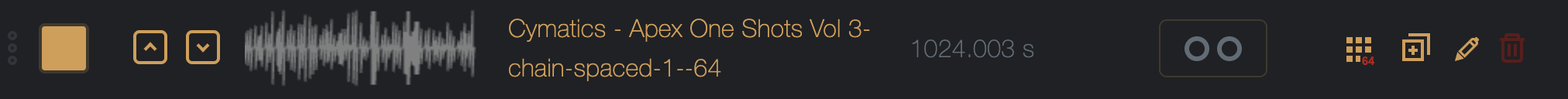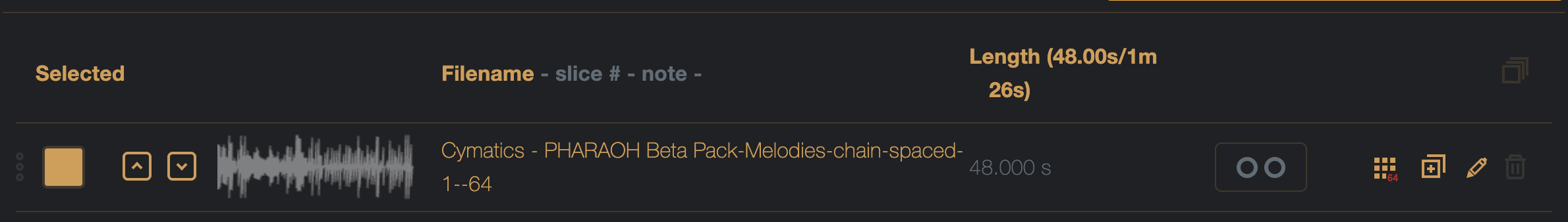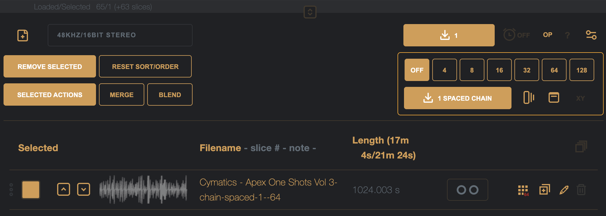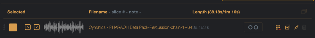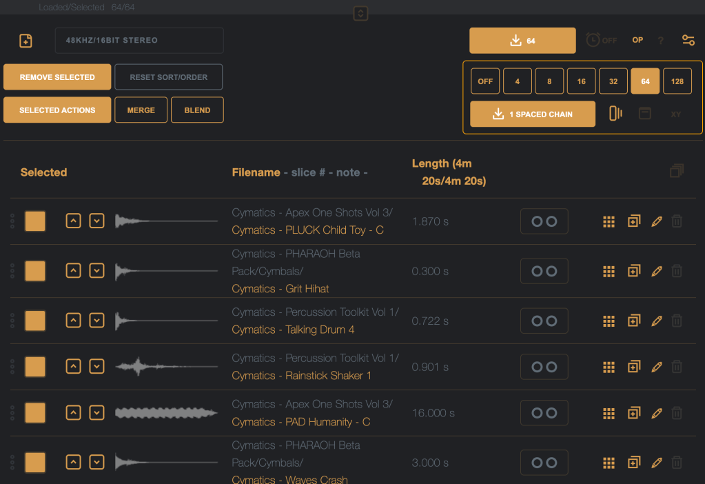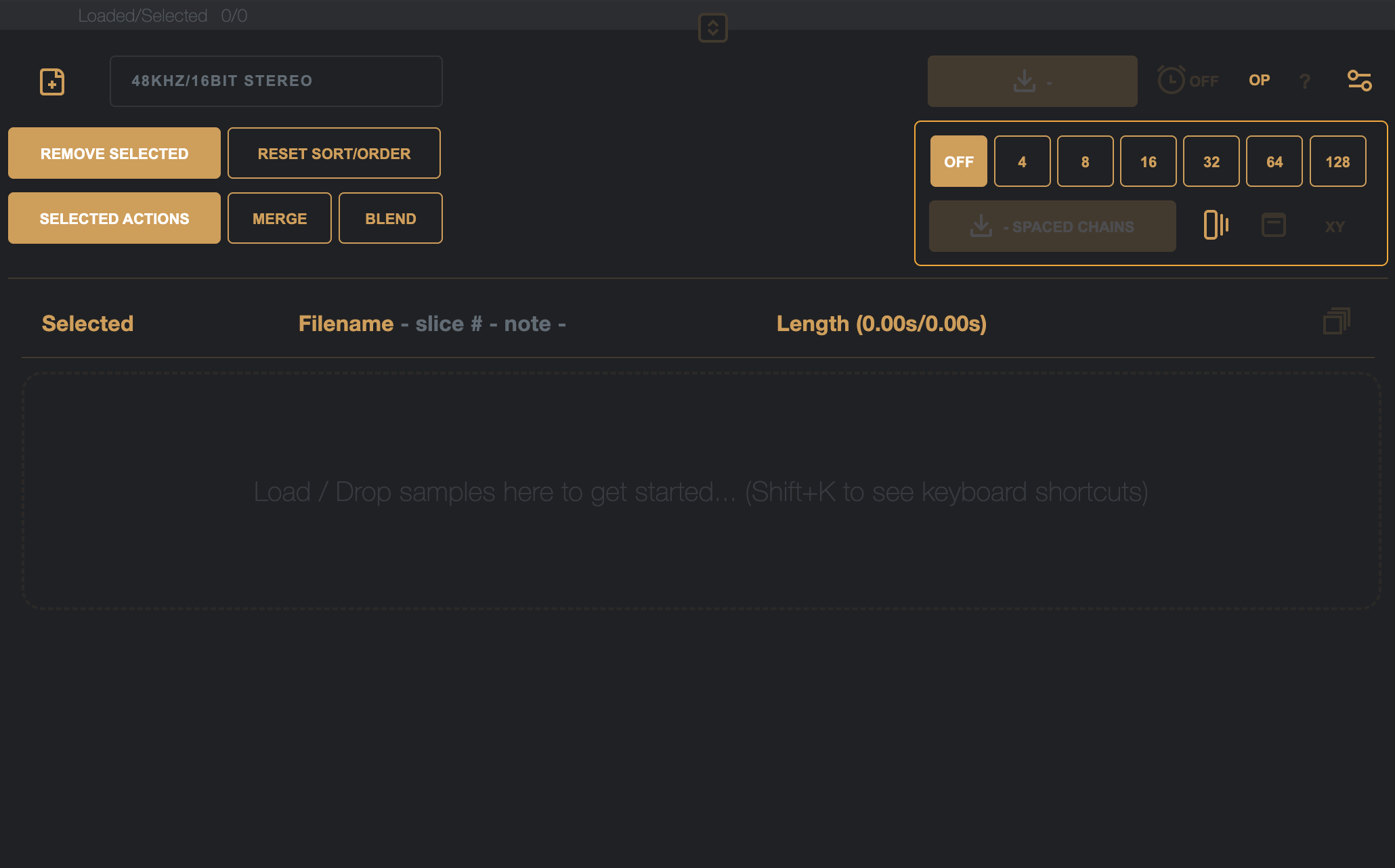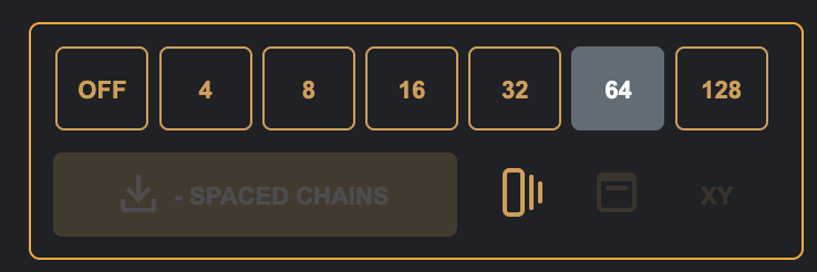 Spaced chain mode on/of – when on, all samples in the chain will be padded with silence to the length of the longest chain (perfect for the Digitakt / Digitakt II or M8 in grid slicing).