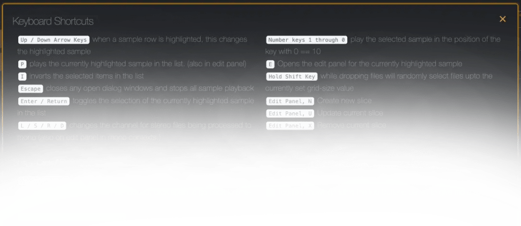 Up / Down Arrow Keys: when a sample row is highlighted, this changes the highlighted sample.P: plays the currently highlighted sample in the list. (also in edit panel).I: inverts the selected items in the list.Escape: closes any open dialog windows and stops all sample playback.Enter / Return: toggles the selection of the currently highlighted sample in the list.L / S / R / D: changes the channel for stereo files being processed to mono (also on edit panel in mono contexts.)Number keys 1 through 0: play the selected sample in the position of the key with 0 == 10.E: Opens the edit panel for the currently highlighted sample.- Holding